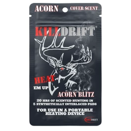“Acorn Blitz” scent pads are associated with the #1 food source of deer. This scent makes for the perfect cover scent and will mask any human odor 100 + yards out! Hang “Acorn Blitz” scent pads from a limb or treestand but for best results insert into an existing portable heating device.